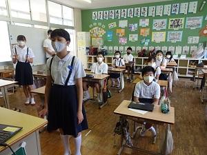6月3日(金)、土砂災害を想定して避難訓練を行いました。避難を告げる放送が掛かると、子どもたちは先生の指示を聞いて、真剣な表情で4階に避難しました。避難完了後は各教室に戻って、校長先生の話を聞いたり、DVDを見たりしました。今日の訓練で、避難のときに「お・は・し・も・ち」を意識して行動することや、命を守るためにどのようにすればいいのかを、しっかりと考えることができました。