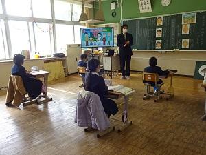 2021年10月6日 15時39分1~4年生は、国際交流員さんと交流しました。アメリカのお話や歌やゲームを紹介してくださり、楽しい活動ができました。